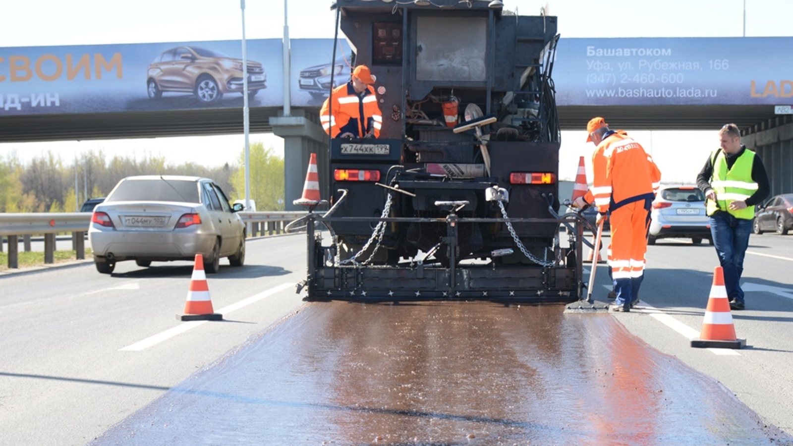УФА, 26 апр 2016. /ИА «Башинформ», Ксения Калинина/. На автодороге Уфа-Аэропорт подрядчик из Санкт-Петербурга 26 апреля начал ремонт дорожного полотна в рамках гарантийных обязательств. В частности, обновляется защитный слой дороги, который защищает асфальт от механических повреждений и предотвращает попадание влаги в глубокие слои дорожного полотна.