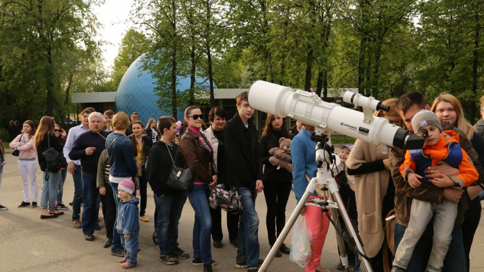 Наблюдение началось в 16.00. Телескопы были установлены на площади перед планетарием, зрители ожидали появления маленькой черной точки на фоне гигантского Солнца. Очередь к телескопам росла с каждой минутой. В 16.11 Меркурий коснулся солнечного диска, а затем и целиком стал виден в окулярах телескопов.