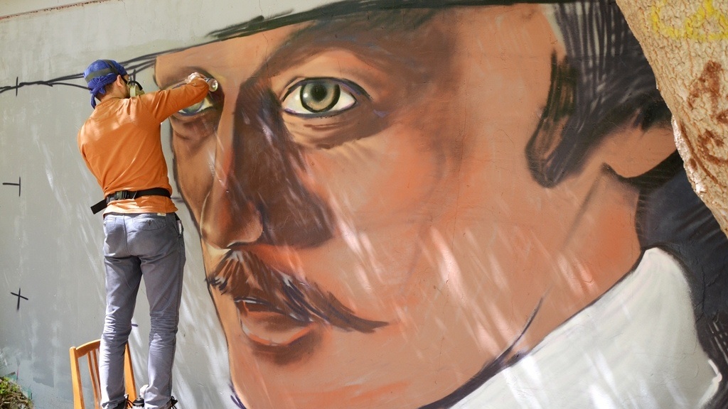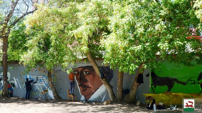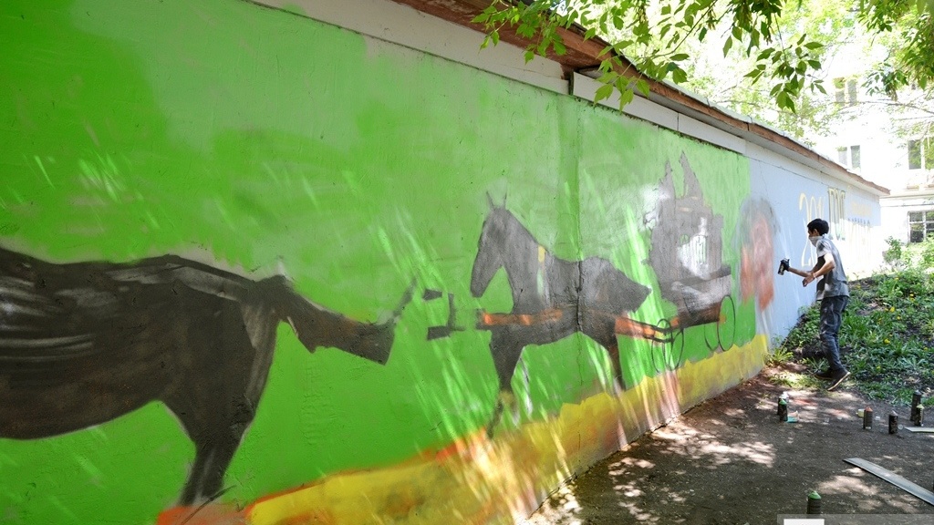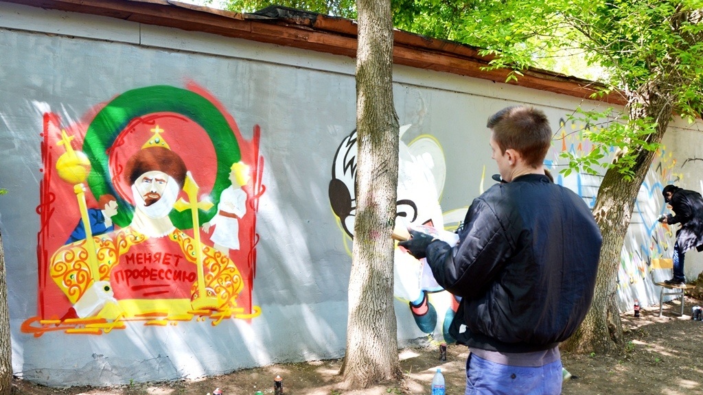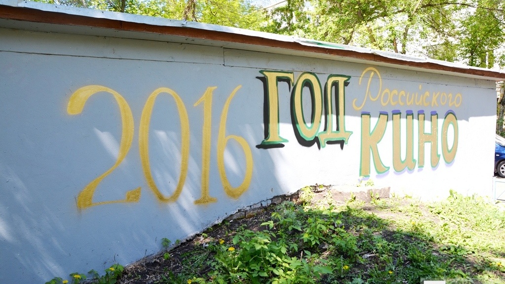 УФА, 18 май 2016. /ИА «Башинформ», Ксения Калинина/. В центре Уфы появились новые граффити. Состоялось подведение итогов конкурса граффити, посвященного Году российского кино. Члены жюри оценили эскизы молодых художников и выбрали семь лучших. 18 мая они воплотили свои идеи, украсив гаражи во дворе дома №51 по улице Ленина.