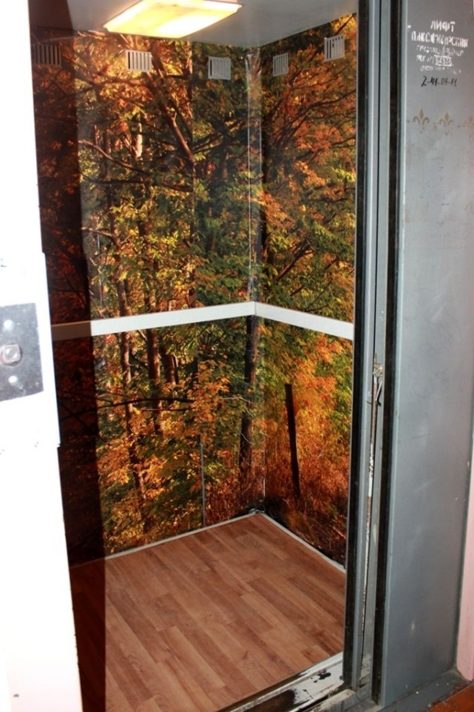 УФА, 18 май 2016. /ИА «Башинформ», Эльмира Сабирова/. В Уфе лифты в домах украшают фотообоями. Благоустраивать кабины взялись сотрудники ЖЭУ №64 Октябрьского района. Сесть в кабину лифта с золотым осенним лесом или видами Санкт-Петербурга посчастливилось жителям микрорайона Сипайлово, в частности, домов по улицам Баязита Бикбая, 23/2, и Юрия Гагарина, 22.