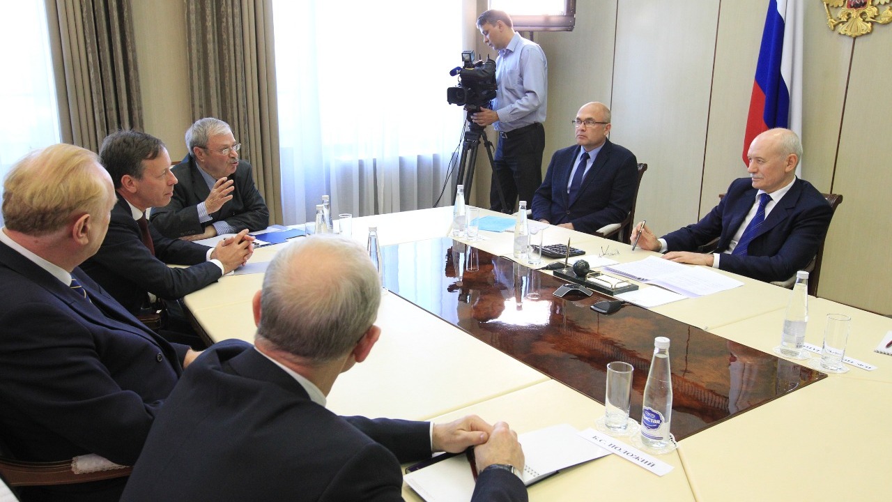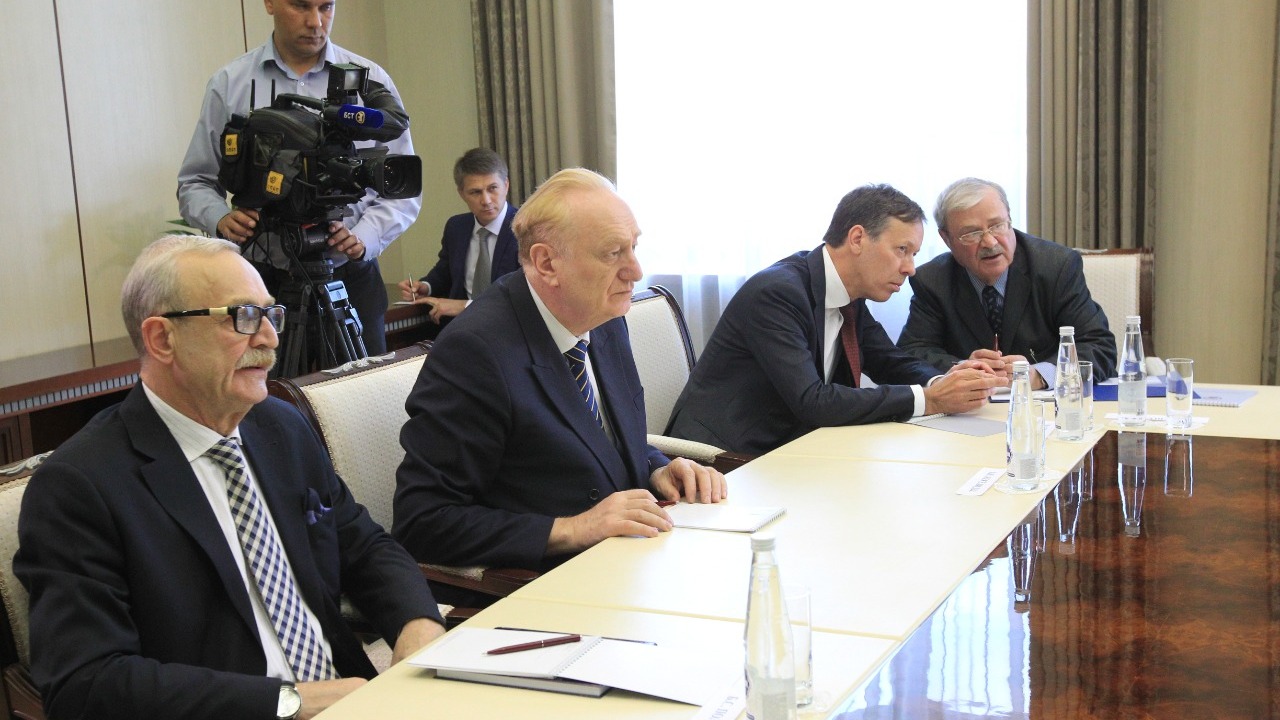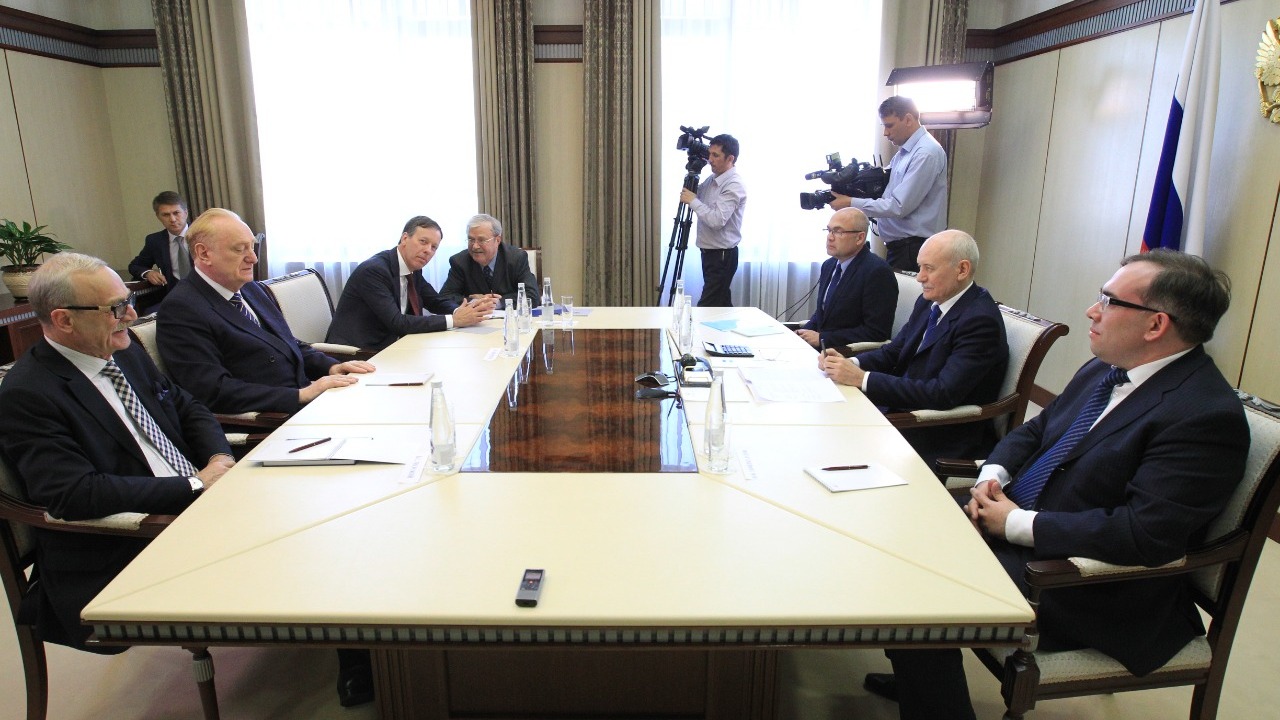УФА, 19 май 2016. /ИА «Башинформ», Александр Смирнов/. 19 мая в Доме Республики Глава Башкортостана Рустэм Хамитов встретился с генеральным директором Федерального медицинского исследовательского центра психиатрии и наркологии имени В.П. Сербского Зурабом Кекелидзе и руководителем программы по охране психического здоровья Европейского регионального бюро Всемирной организации здравоохранения Мэттом Мьюджином. В Уфе они принимают участие в VI Национальном конгрессе по социальной психиатрии и наркологии, который проходит в Конгресс-холле.