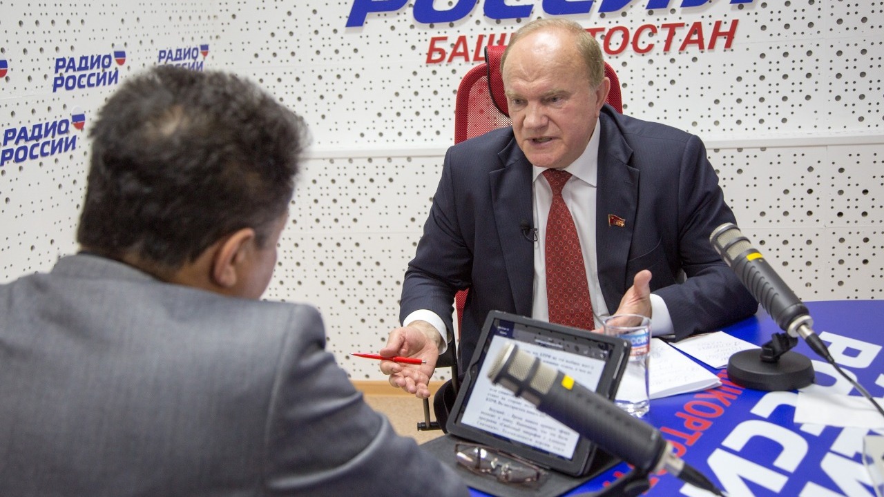 УФА, 20 май 2016. /ИА «Башинформ», Сергей Захаров/. 20 мая в прямом эфире «Радио России Башкортостан» выступил лидер российских коммунистов Геннадий Зюганов.