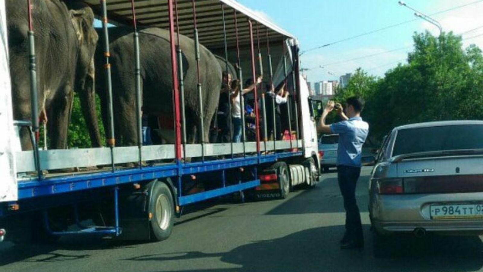 УФА, 30 май 2016. /ИА «Башинформ», Ольга Муртазина/. В Уфе горожане увидели слонов-промоутеров. В воскресенье по центру города ездил грузовик с тремя индийскими слонами. Автомобилисты - участники группы «БашДТП», разместили в сети снимки сфотографировавшихся с гигантскими животными смельчаков. Ранее сообщалось, что в столицу Башкортостана приезжает новая цирковая программа. Планировалось, что слоны прогуляются по городу для привлечения зрителей. Но в итоге их прокатили на открытой платформе для всеобщего обозрения.