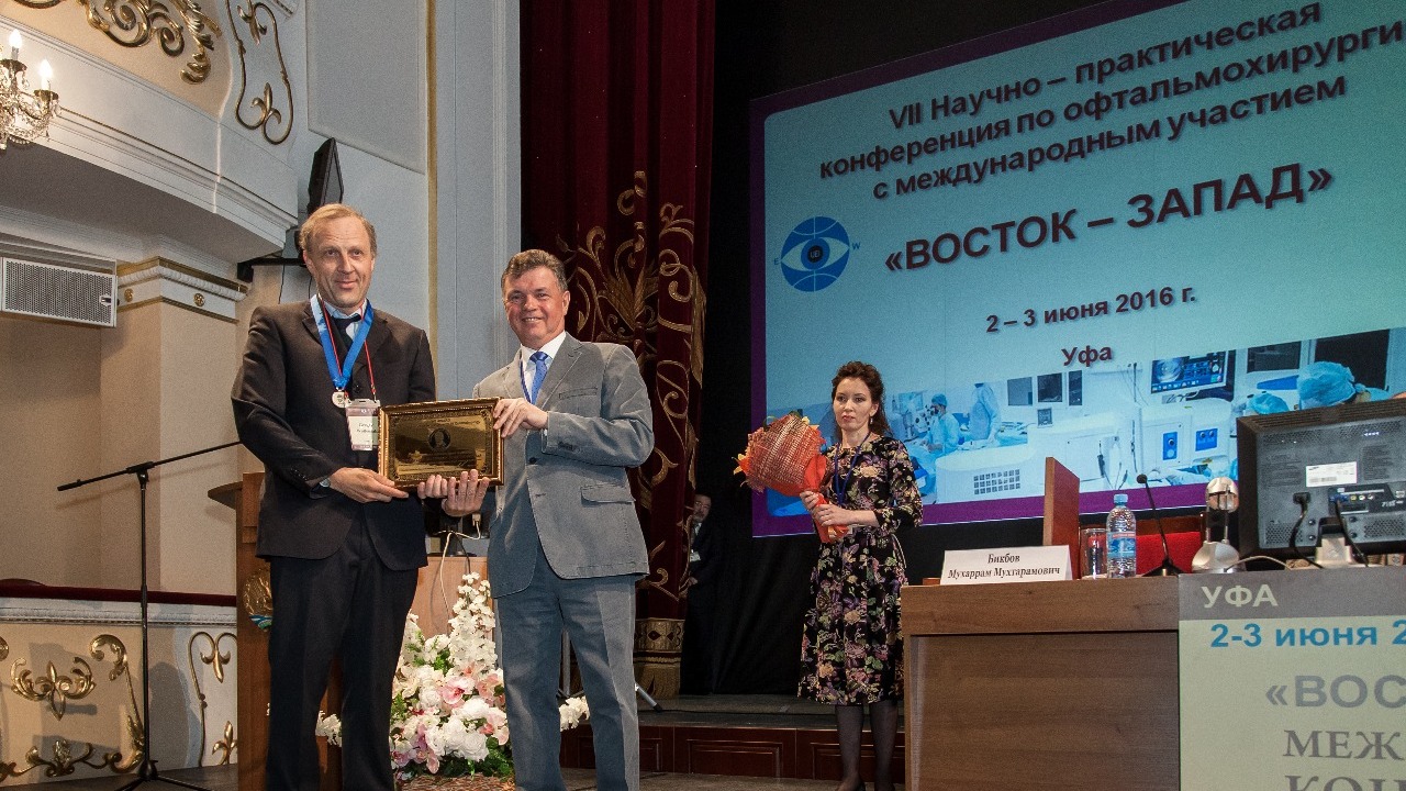 Церемония награждения состоялась в рамках VII Международной научно-практической конференции по офтальмохирургии «Восток - Запад-2016», которая проходит в Уфе 2-3 июня, в Башкирском государственном театре оперы и балета. Около тысячи ведущих специалистов, главных врачей офтальмологических клиник, заведующих кафедрами глазных болезней из разных городов России, стран СНГ, делегаты более чем 17 стран ближнего и дальнего зарубежья традиционно собрались в башкирской столице для обсуждения самых современных тенденций в области офтальмологии. В течение двух дней запланированы пленарные заседания, обучающие курсы, сателлитные симпозиумы по направлениям: новые технологии факоэмульсификации катаракт, лечение заболеваний стекловидного тела и сетчатки, патология роговицы и рефракционная хирургия, диагностика и лечение глаукомы, воспалительные заболевания глаз, детская офтальмопатология, травмы органа зрения, организация офтальмологической помощи.