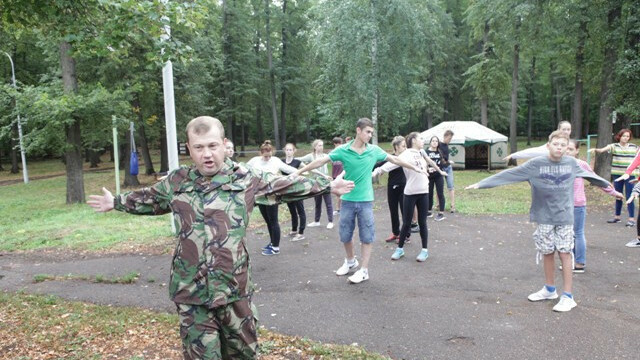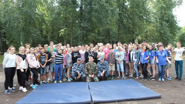 Алексей Маслов построил для разминки отдыхающих, почти 80 человек в возрасте от 10 до 15 лет. После разминки Линар Юсупов и Айнур Кузбеков продемонстрировали несколько приемов самообороны, в том числе защиту от ножа.