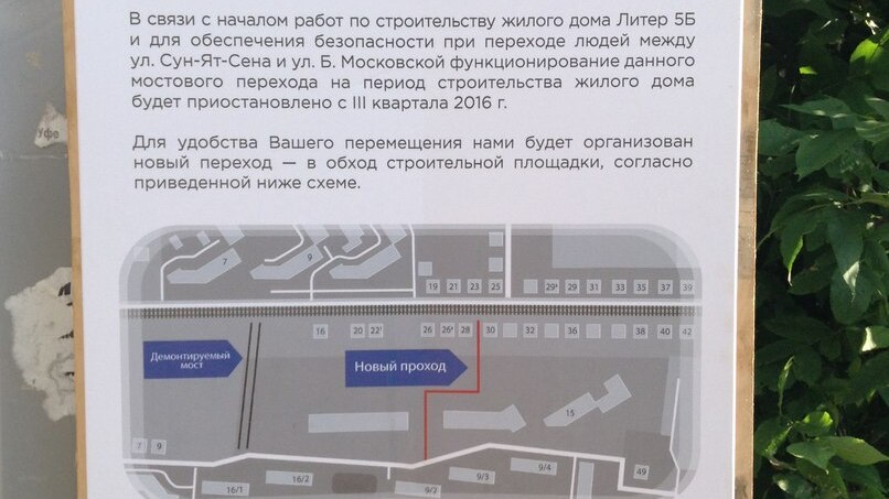 Объявление о скором демонтаже моста появилось возле него в середине августа. «В связи с началом работ по строительству жилого дома литер 5Б и для обеспечения безопасности при переходе людей функционирование моста будет приостановлено с III квартала 2016 года», - говорится в тексте.