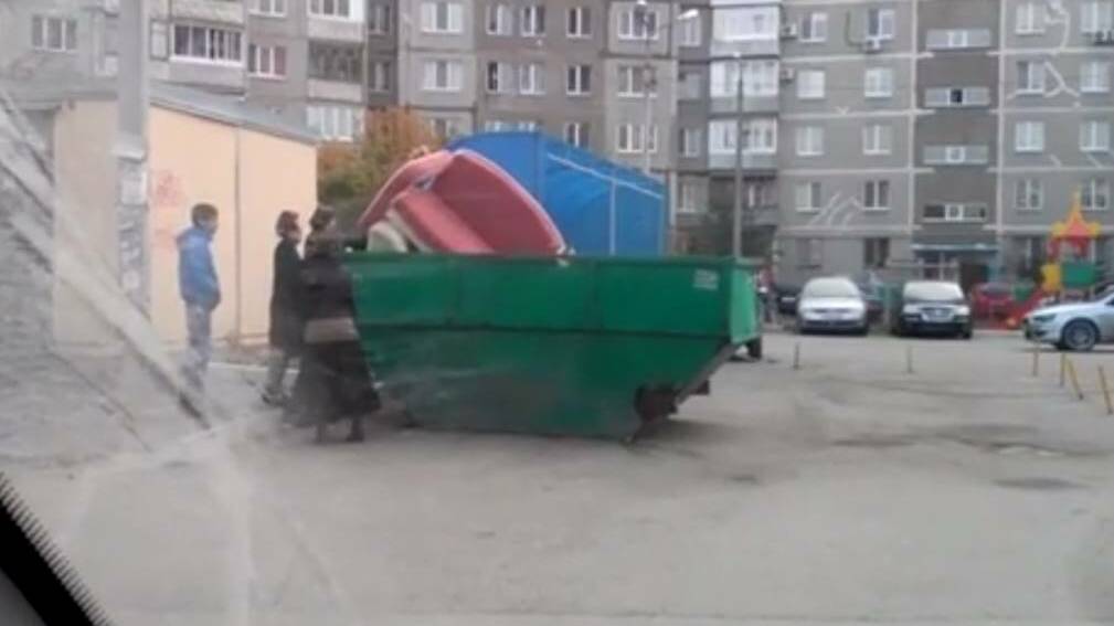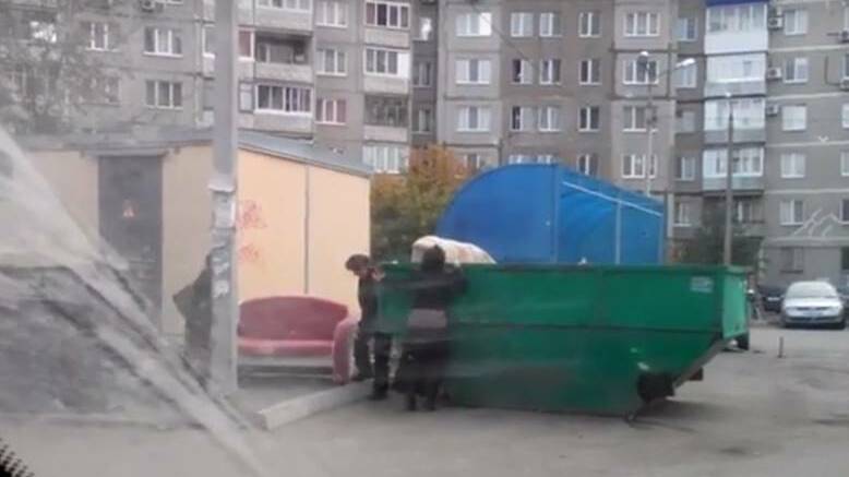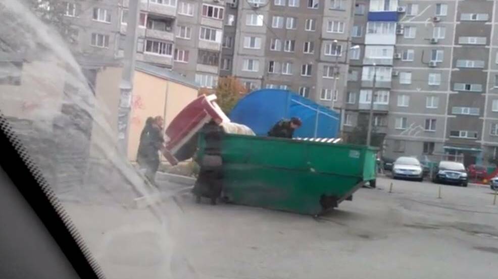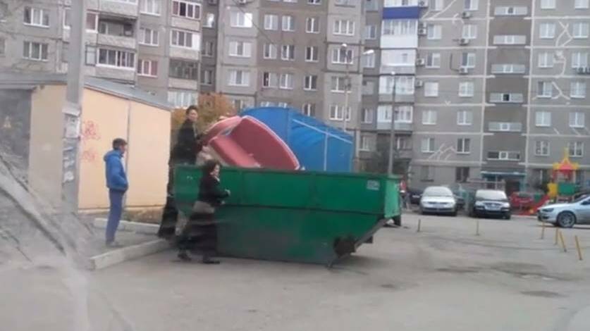 Кто-то, возможно, переезжая, выкинул два дивана — розовый и бежевый — в огромный мусорный контейнер. Это привлекло внимание четырех взрослых женщин и одного мужчины. По видео можно наблюдать, как они долго изучают находку, решая, как бы ее достать. В итоге мужчина не стал помогать и ушел, а одна дама залезла в бак и вытолкнула розовый диван «на волю». Ее помощницы приняли мягкую мебель и потащили в неизвестном направлении. По всей видимости, на очереди бежевый диван.