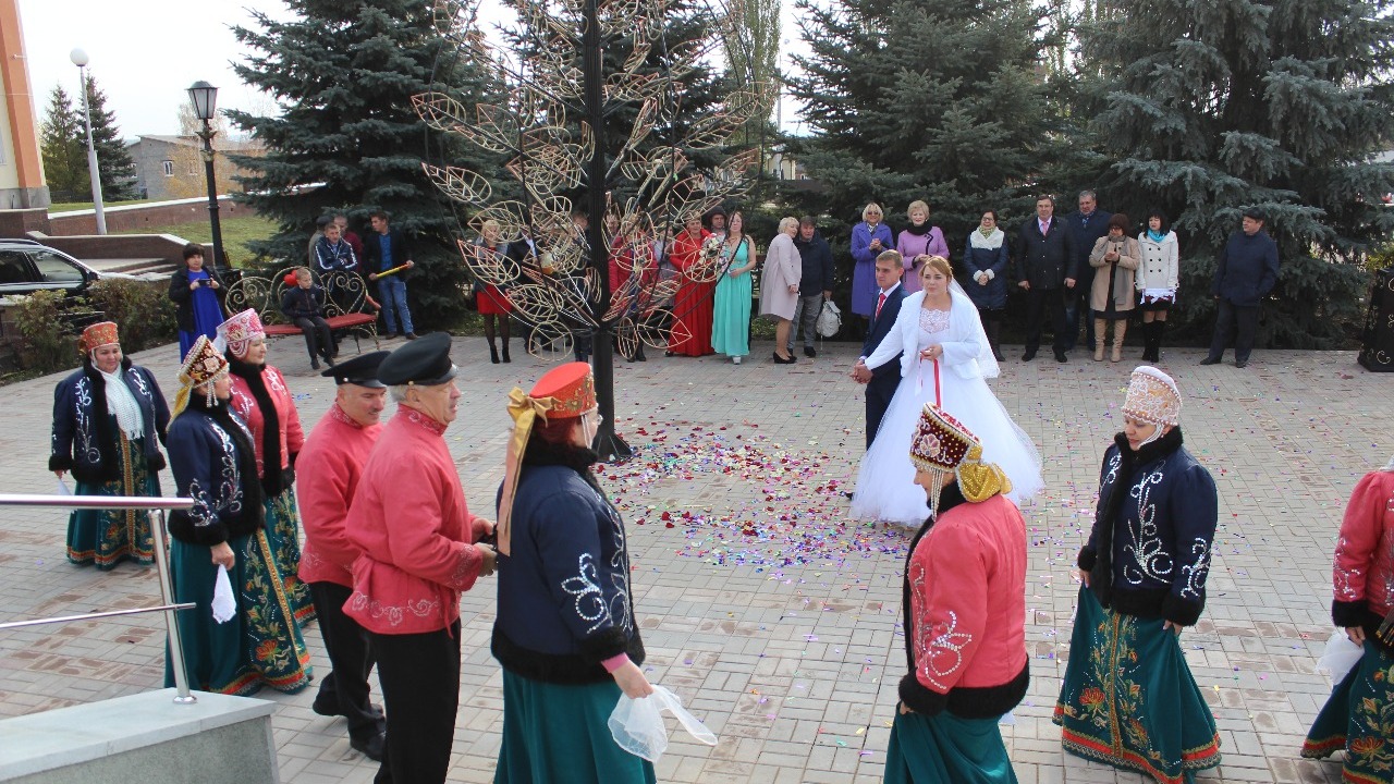 Приняв поздравления родных, вместе с народным вокальным ансамблем «Уралочка» молодожены закружилась в свадебном хороводе, сообщила Любовь Белова, корреспондент газеты «Панорама».