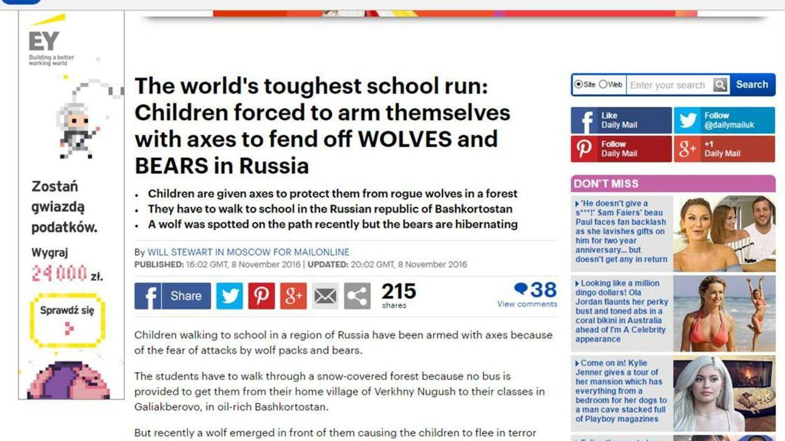 УФА, 10 ноя 2016. /ИА «Башинформ», Ксения Калинина/. Вооруженные топорами башкирские школьники прославились на весь мир. Видео похода детей в учебное заведение через лес попало в зарубежные СМИ. Крупное британское издание Daily Mail опубликовало статью и видео под заголовком The world's toughest school run: Children forced to arm themselves with axes to fend off WOLVES and BEARS in Russia («Самая сложная дорога в школу в мире: Дети вынуждены вооружаться топорами, чтобы защищаться от волков и медведей в России»).