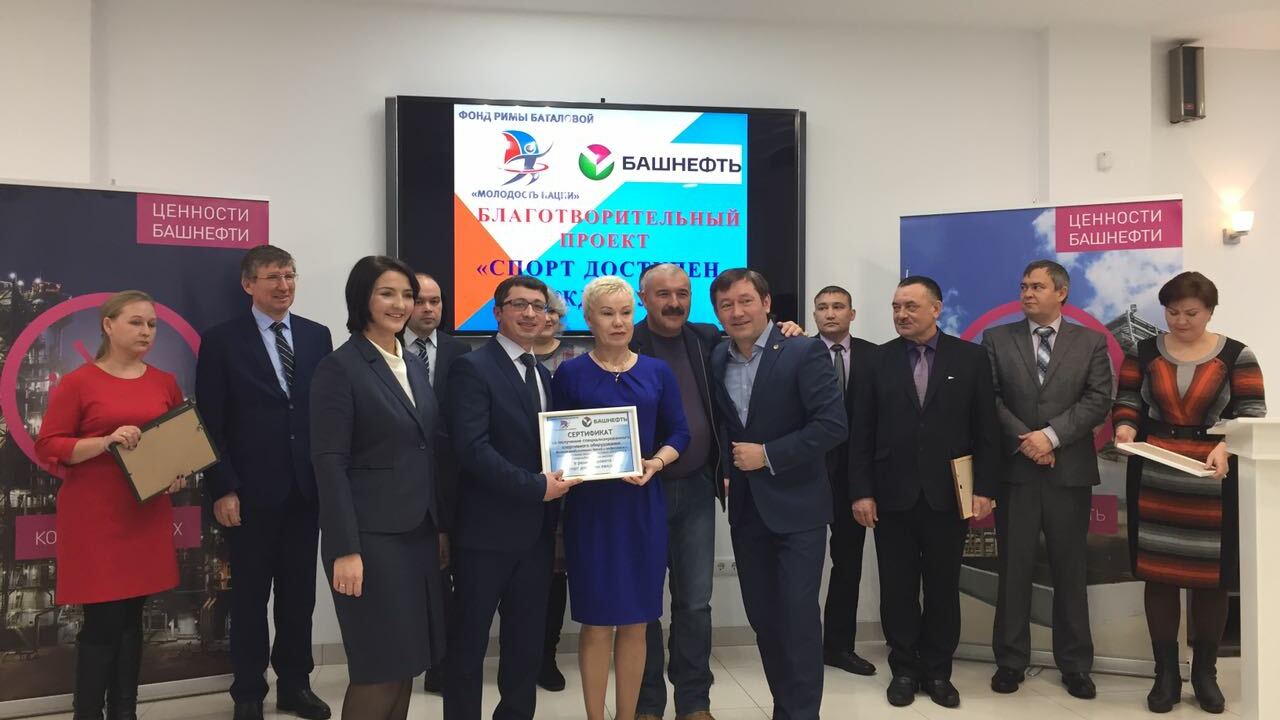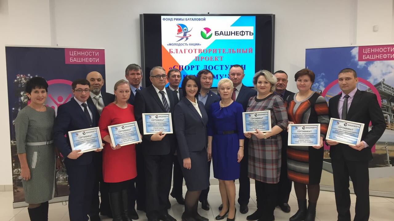 УФА, 6 дек 2016. /ИА «Башинформ», Арина Рахимкулова/. В Уфе во вторник, 6 декабря, состоялась передача сертификатов на новое оборудование для шести реабилитационных центров Башкортостана. Мероприятие приурочено к декаде инвалидов. Специализированные тренажеры приобретены в рамках благотворительного проекта «Спорт доступен каждому». Программа реализуется региональным общественным фондом Римы Баталовой «Молодость нации» и компанией ПАО АНК «Башнефть».