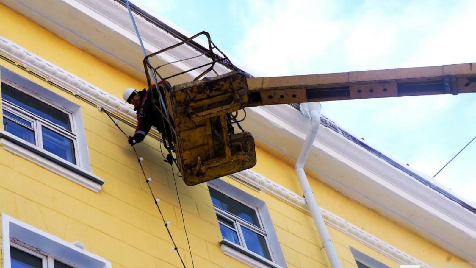 В северной части Уфы на фасадах домов монтируют новогоднюю иллюминацию