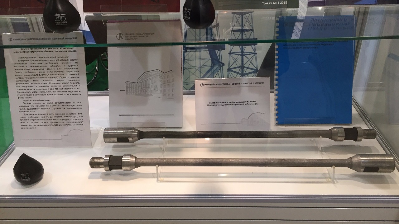По сообщению РИА Новости, УГНТУ на выставке представил уникальные штанги для глубинных скважинных насосов. Инженерные решения уфимских ученых позволяют существенно повысить прочность штанг и, соответственно, увеличить срок их службы.