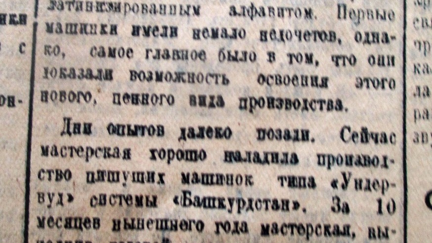 «Несколько лет тому назад механическая мастерская Башдеткомиссии, в которой работают бывшие беспризорники, выпустила первые опытные пишущие машинки типа «Ундервуд» с башкирским латинизированным алфавитом», - сообщает газета. Несмотря на то, что первые машинки имели много недочетов, предприятие доказало возможность освоения этого нового, ценного вида производства. К 1936 году мастерская хорошо наладила производство пишущих машинок системы «Башкурдстан». Уже за 10 месяцев мастерская выполнила годовой план, выпустив 331 пишущую машинку. До конца года предприятие намеревалось собрать сверх плана 70 машинок.