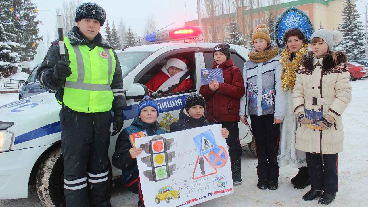 Вместе с сотрудниками отдела ГИБДД на дороге напротив площади ГДК несли дежурство главные зимние персонажи – Дед Мороз и Снегурочка. В роли главного героя Нового года выступил инспектор по пропаганде безопасности дорожного движения Эльмир Бикчантаев, а его внучкой стала учитель школы №4 Наталья Силина. Помогали им в проведении неординарного мероприятия юные инспектора дорожного движения (ЮИД), которые принесли с собою плакат, призывающий к безопасности на дорогах. «Не гоните, водители, ведь вы тоже родители!» - так гласила одна из записей на нем.