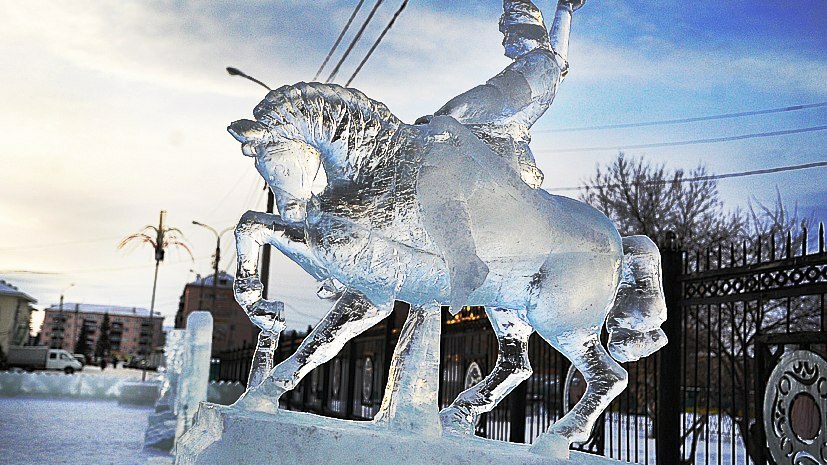 В городе Учалы также появилась новогодняя достопримечательность: мастер Ринат Шакиров изваял изо льда копию знаменитого конного памятника Салавату Юлаеву.