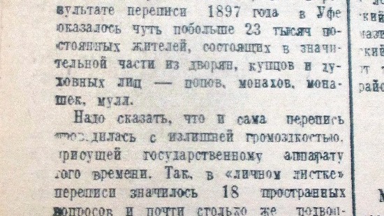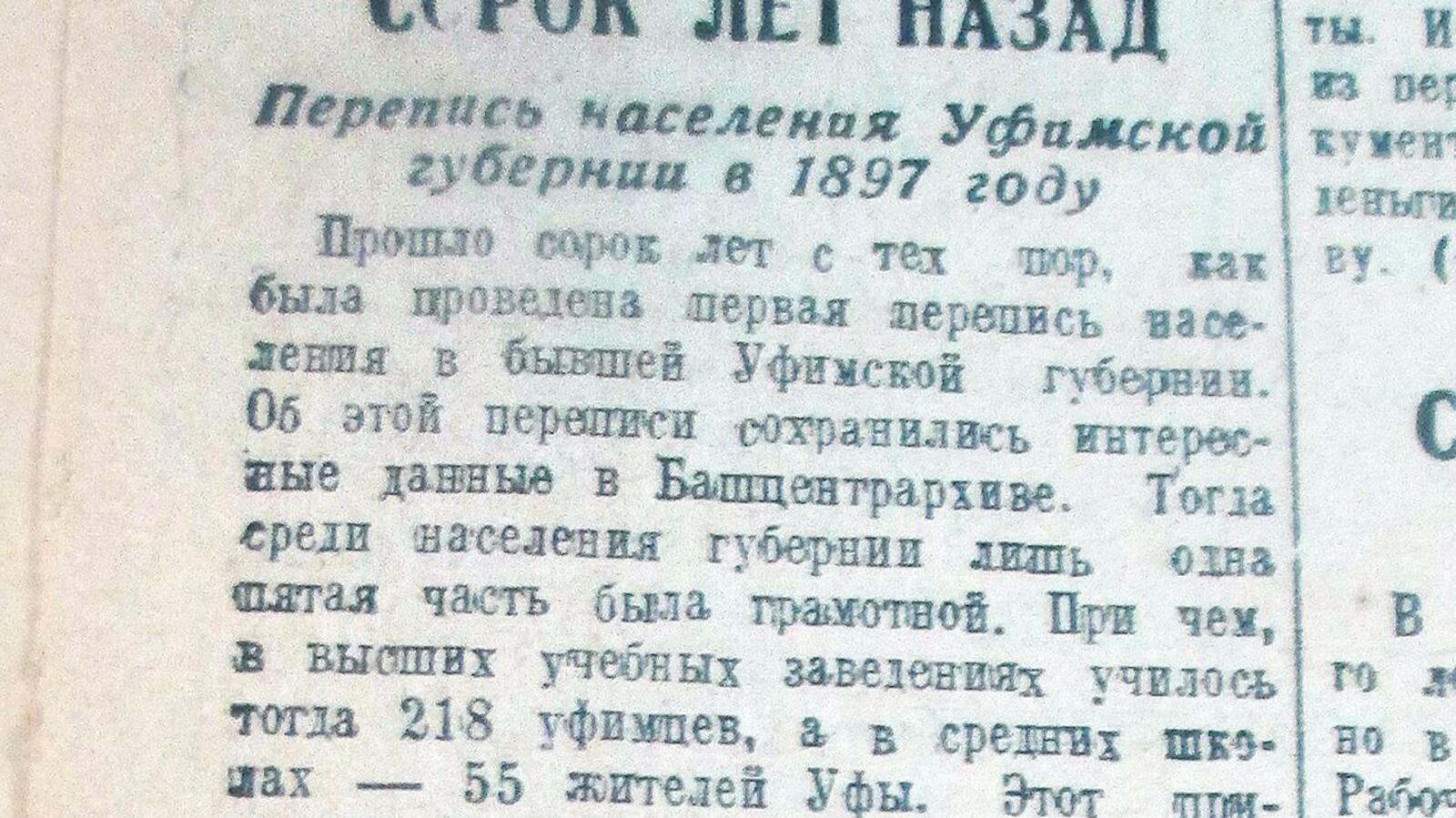 В 1897 году в Уфимской губернии была проведена первая перепись населения, сообщает газета и приводит интересные данные из Башцентрархива. «Тогда среди населения губернии лишь одна пятая часть была грамотной, причем в высших учебных заведениях училось 218 уфимцев, а в средних школах - 55 жителей Уфы», - приводит издание цифры сорокалетней давности. В газете отмечается, что в то время «неграмотность, бескультурье, народная темнота почитались как основа государства». По итогам переписи 1897 года в Уфе оказалось «чуть побольше 23 тысяч постоянных жителей, состоящих в значительной части из дворян, купцов и духовных лиц - попов, монахов, монашек, мулл». Как полагает автор статьи, первая перепись проводилась «с излишней громоздкостью, присущей государственному аппарату того времени». В «личном листке» переписи было 18 пространных вопросов и почти столько же подвопросников. Газета приводит некоторые из них: «в каком полицейском участке записан; как приходитесь квартирохозяину по родству; ваше сословие; если занимаетесь ремеслом или торговлей, то хозяин вы или служащий; имеете ли вы доход с капитала имения; сколько времени вы без занятий».