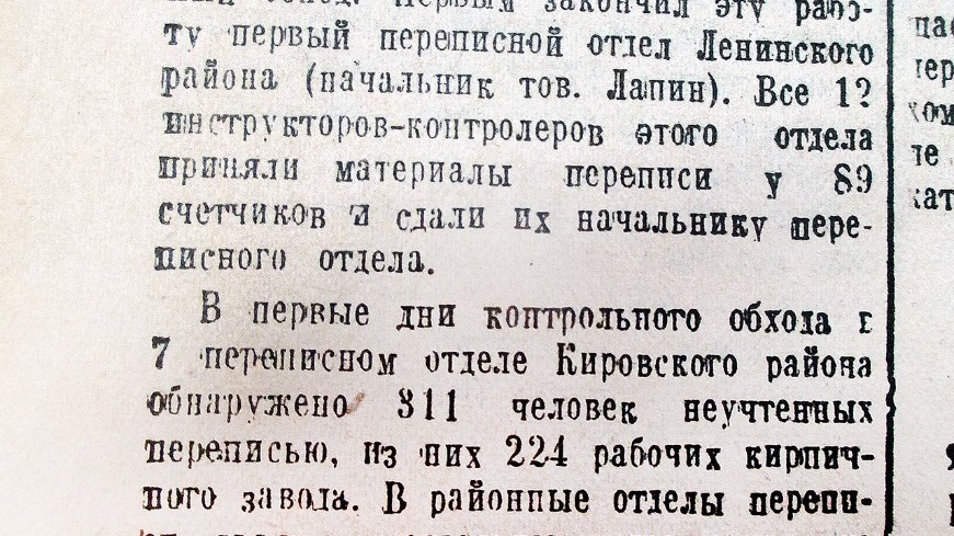 12 января 1937 года газета сообщает, что Всесоюзная перепись населения вступила в последний этап, проверялась правильность счета населения. «За три дня из 1092 счетных участков Уфы 828 участков уже закончили контрольный обход», во время которого в переписном отделе Кировского района было обнаружено 311 человек, неучтенных переписью. Граждане, не прошедшие перепись, сами являлись в районные отделы. В газете отмечается, что «только 8 января в горбюро по переписи населения явилось 29 человек». В Башкирии разработка материалов переписи продлится 4-5 месяцев, сообщает издание.