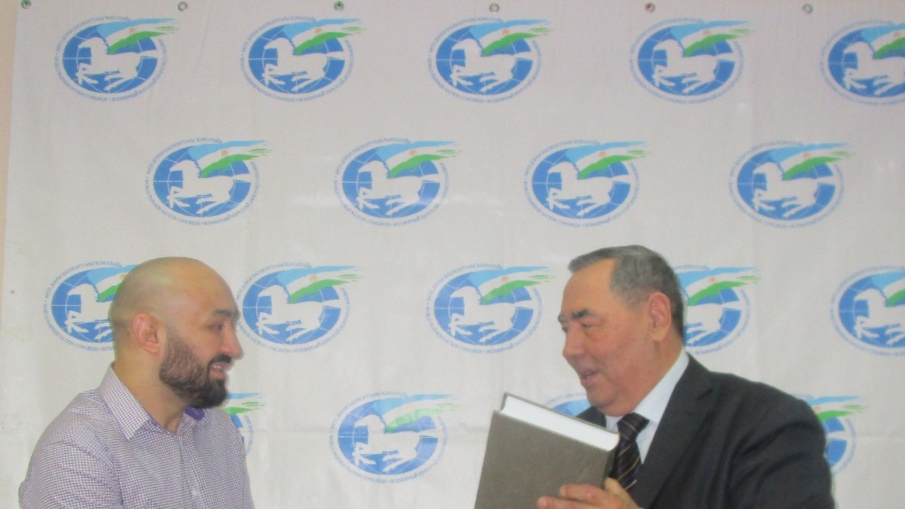 На память о встрече титулованному бойцу от имени Всемирного Курултая башкир подарили книгу «Башкиры» из серии «Народы и культуры».