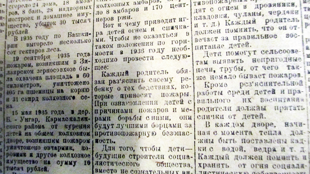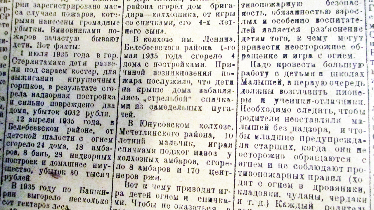 В 1935 году по Башкирии было зарегистрировано большое количество пожаров, которые нанесли громадные убытки. Зачастую виновниками возгораний становились дети, констатирует газета и приводит факты. 1 июля 1935 года в Стерлитамаке дети развели под сараем костер для выжигания игрушечных горшков, в результате сгорела надворная постройка и были повреждены два дома. В апреле того же года в Белебеевском районе от детской шалости с огнем сгорело 24 дома и 28 надворных построек, убыток составил 30 тысяч рублей. В мае 1935 года в Кармаскалинском районе дети курили на колхозном дворе, в результате пожар уничтожил коровник и другое имущество на сумму 10 тысяч рублей, отмечается в газете. В Мечетлинском районе десятилетний мальчик поджег навоз у колхозных амбаров, сгорело восемь амбаров и 170 центнеров ржи. В праздничный день 1 мая 1935 года в Белебеевском районе дети на крыше дома забавлялись «стрельбой» спичками из самодельных пугачей, в результате пожаром уничтожено четыре дома с постройками. В сентябре того же года пожаром, возникшим в Зилаирском зерносовхозе, была охвачена площадь в 60 километров. Тогда огонь уничтожил 405 га пшеницы и 31 скирд сена, информирует издание.