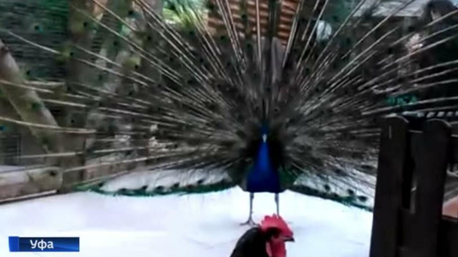 В зоопарке Уфы павлин решил отстоять свою территорию и предстал во всей красе