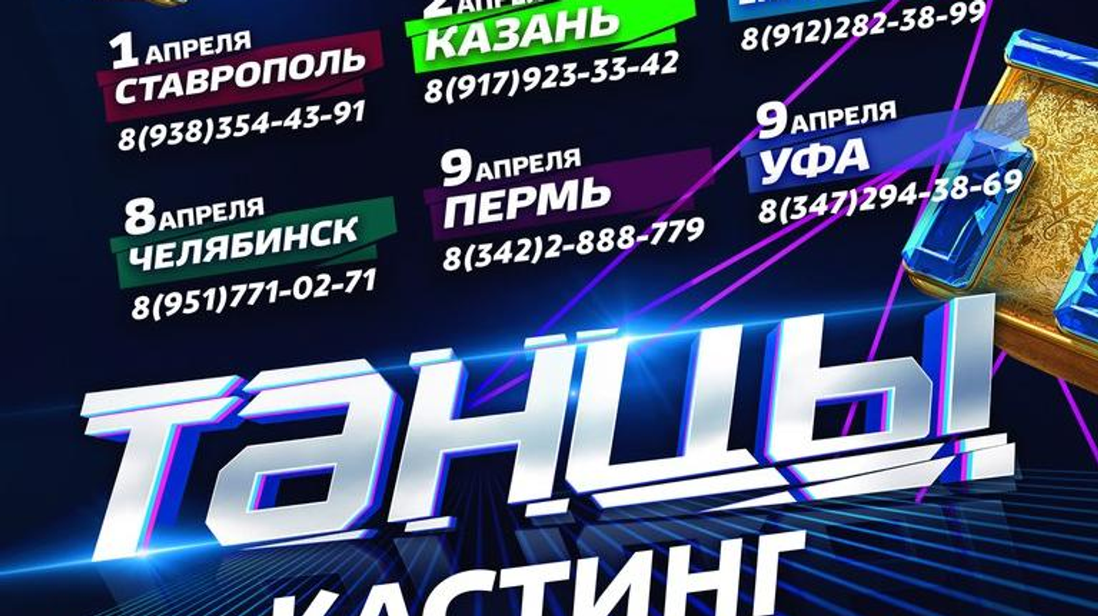 УФА, 17 мар 2017. /ИА «Башинформ», Ксения Калинина/. В Уфе пройдет кастинг четвертого сезона шоу «Танцы» на ТНТ. Для участия необходимо предварительно заполнить анкету и прийти на отборочный тур 9 апреля в студию танцев El Ritmo по адресу: ул. Коммунистическая, 45/3.