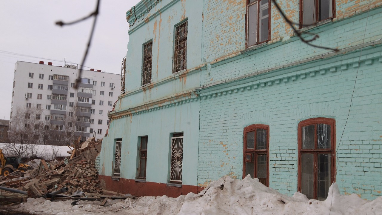 УФА, 23 мар 2017. /ИА «Башинформ», Гульфия Акулова/. В Уфе начали сносить часть здания 11-го Приходского училища на улице Кустарной, 19, сообщают активисты движения «Архзащита Уфы».