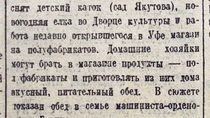 «Первый маршрут» - так назывался сюжет киножурнала, посвященный пуску в Уфе трамвая. В сюжете «Счастливое детство» показаны детский каток в саду Якутова, новогодняя елка во Дворце культуры и работа недавно открывшегося в Уфе магазина полуфабрикатов. «Домашние хозяйки могут брать в магазине продукты-полуфабрикаты и готовить из них дома вкусный, питательный обед», - советуют авторы. В качестве примера в киножурнале показан обед в семье машиниста Гурина. В издании отмечается, что режиссером киножурнала является известный советский оператор Леон