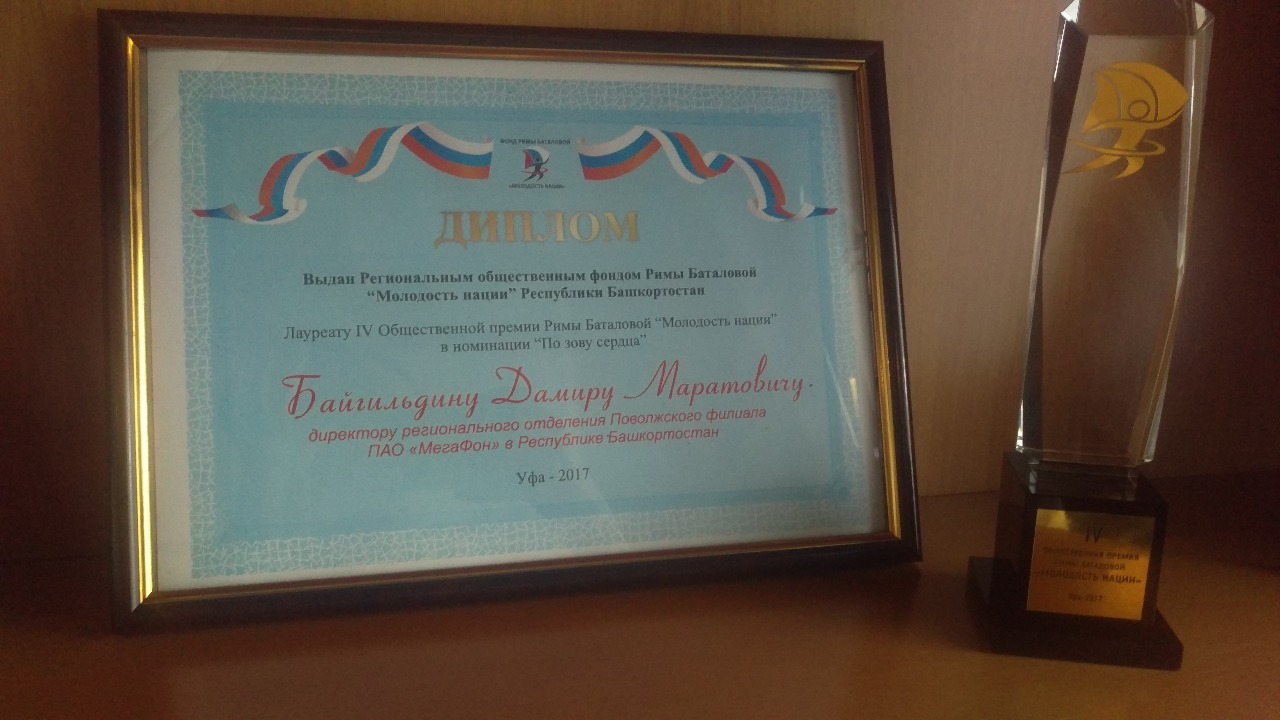 УФА, 26 апр 2017. /ИА «Башинформ»/. МегаФон стал лауреатом общественной премии «Молодость нации» в номинации «По зову сердца». Премия вручается региональным общественным фондом Римы Баталовой и позволяет выявить лучших молодых спортсменов с ограниченными возможностями здоровья, тренеров, благотворителей, а также СМИ.