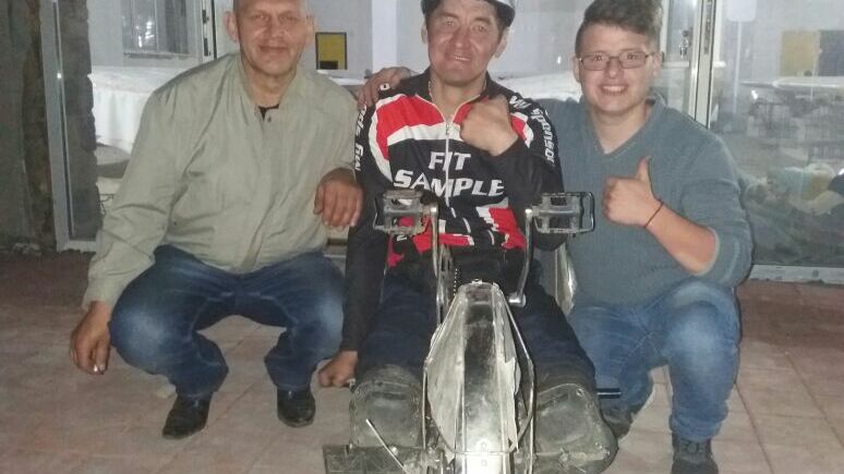 Сейчас путешественник разместился в гостинице райцентра Карабалыкского района Казахстана.Не обошлось и без ЧП — за 500 метров до поселка Карабалык на велоколяске лопнуло колесо, и мужчина оказался в темное время суток в безвыходном положении. Но тут же на собственном примере убедился в силе дружбы и взаимовыручки. Узнав, что ему требуется помощь, организатор велопробега и его работодатель, редактор районной газеты «Сельская империя» Халида Кулкашева вышла на связь со своими бывшими учениками из Казахстана. Женщина 30 лет назад работала учителем в школе города Аркалык и дружбу с учениками поддерживает до сих пор. Путешественника устроили в гостиницу, накормили, купили насос, камеру и подшипники.