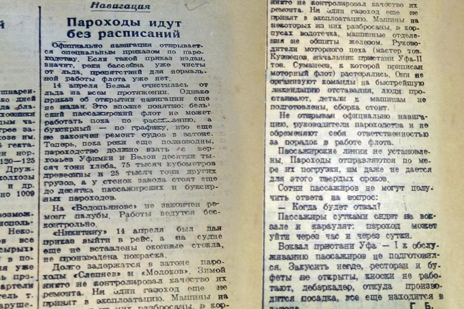 «14 апреля Белая очистилась ото льда, однако приказ об открытии навигации еще не издан», - информировала газета. Из-за того, что не был завершен ремонт судов, бельский пассажирский флот не мог работать по расписанию, а буксирный - по графику. Пока реки полноводны, пароходству необходимо было взять с верховьев Уфимки и Белой десятки тысяч тонн хлеба, 75 тысяч кубометров древесины и 25 тысяч тонн других грузов. Однако, как выяснили корреспонденты, «на «Водопьянове» не закончен ремонт палубы. Работы ведутся бесконтрольно. «Никитину» 14 апреля дан приказ выйти в рейс, а на судне еще не вставлены оконные стекла».