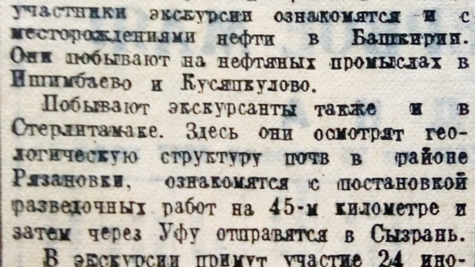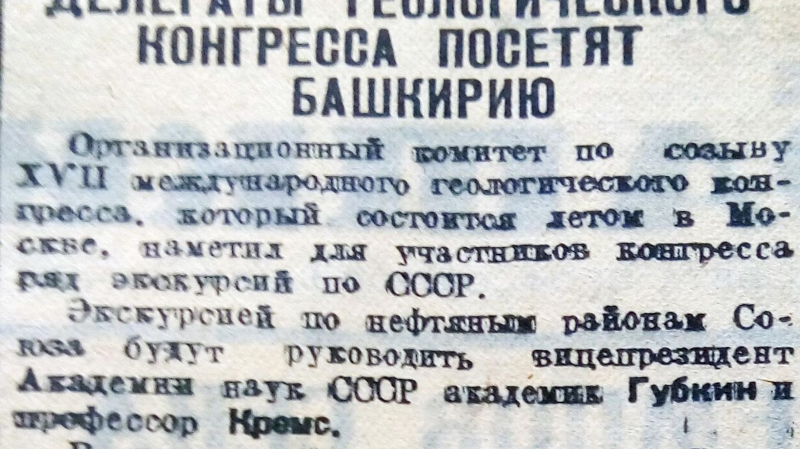 «Организационный комитет по созыву XVII международного геологического конгресса, который состоится летом в Москве, наметил для его участников ряд экскурсий по СССР», - информировала газета. Для иностранных делегатов форума - американцев, англичан, японцев и представителей других государств, была запланирована экскурсия по нефтяным районам Советского Союза. В частности, под руководством вице-президента Академии наук СССР академика Ивана Губкина и профессора Андрея Кремса «участники экскурсии ознакомятся с месторождениями нефти в Башкирии. Они побывают на нефтяных промыслах в Ишимбаево и Кусяпкулово, - говорится в публикации. - Побывают экскурсанты также в Стерлитамаке. Здесь они осмотрят геологическую структуру почв в районе Рязановки, ознакомятся с постановкой разведочных работ на 45-м километре и затем через Уфу отправятся в Сызрань».