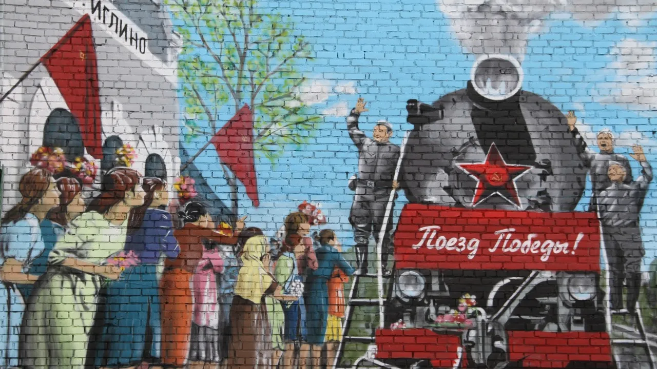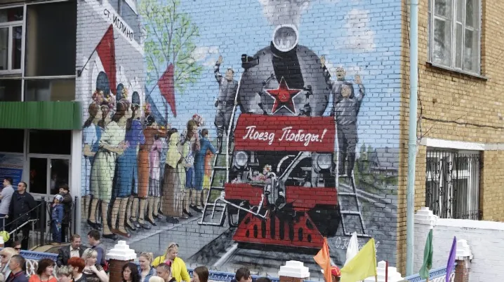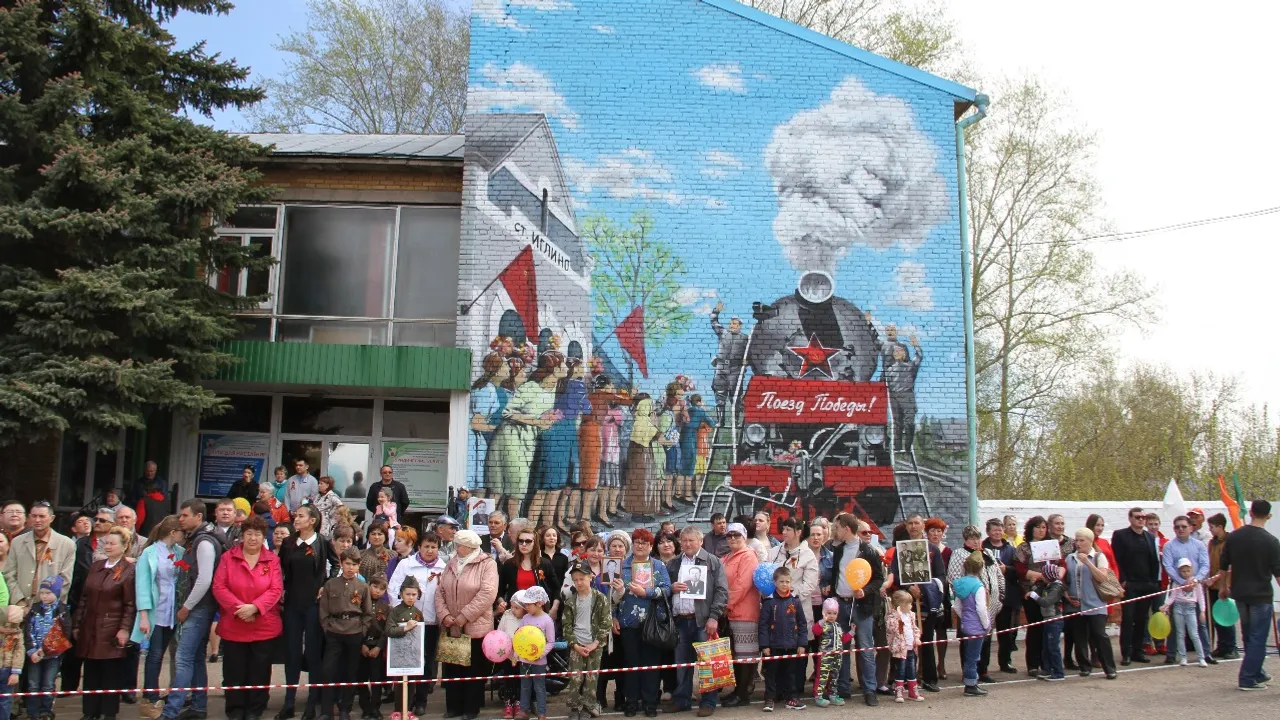 УФА, 11 май 2017. /ИА «Башинформ», Сергей Захаров/. Райцентр Иглинского района украсила картина «Поезд Победы». Огромное полотно разместилось на здании многофункционального центра. Работу над созданием исторического художественного образа известный художник-монументалист Олег Кайбышев начал за две недели до празднования Дня Великой Победы. Несмотря на непростые погодные условия уложился в положенный срок. По словам живописца, изначально он планировал изобразить уходящий на фронт состав, но передумал в последний момент.
