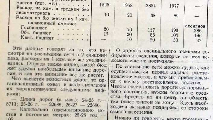 Газета приводит данные о состоянии дорог в республике к 1927 году. В целом из 6325 км дорог государственного, областного и кантонного значения исправны были 6,3 процента. Из 22 470 погонных метров мостов соответствовали нормам 48 процентов. Однако на дорогах волостного значения показатель исправности мостов составлял всего 0,3 процента. Сведения о дорогах специального значения вовсе отсутствовали. Бездорожье приносило хозяйствам громадные убытки, влияло на товарооборот и себестоимость продукта. В итоге било по карману и крестьянина, и горожанина. Чтобы восстановить дороги до нормального состояния, требовались огромные средства. «Ведомствам необходимо позаботиться о создании фонда на восстановление дорог специального значения и передаче его дорожной организации, - призывает газета. - Например, в Москве организовали Акционерное Общество по дорожному строительству. Что-либо в этом направлении мы могли бы сделать и у себя, хотя бы - отчислением возможной суммы». К примеру, Башнаркомтруд отпускал средства на дорожное строительство с целью ослабить безработицу. Таким образом, у каждого ведомства могла найтись своя цель по отношению к дорогам. «Попутные сборы с отправленных грузов по примеру довоенному следовало бы и теперь обратить по назначению, то есть на дорожное строительство», - предложили в издании.