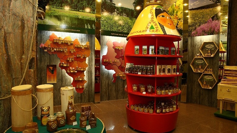 Гостей из Крыма впечатлила концепция магазина-музея, оформленного с башкирским национальным колоритом, где представлены как бортничество, колодное и рамочное пчеловодство, так и современные достижения отрасли. В Доме расположена центральная экспозиция – огромная стилизованная медовая струя, стекающая в большую пиалу, композиция с пчеловодом, работающим на бортевом дереве, витрины в форме силуэтов карт шести природно-хозяйственных зон региона с мёдом пчеловодов из всех районов, - всего около 70 видов разнообразной медовой пищевой и лечебно-профилактической продукции. Сегодня бренд «башкирский мед» узнаваем не только в России, но и за ее пределами.