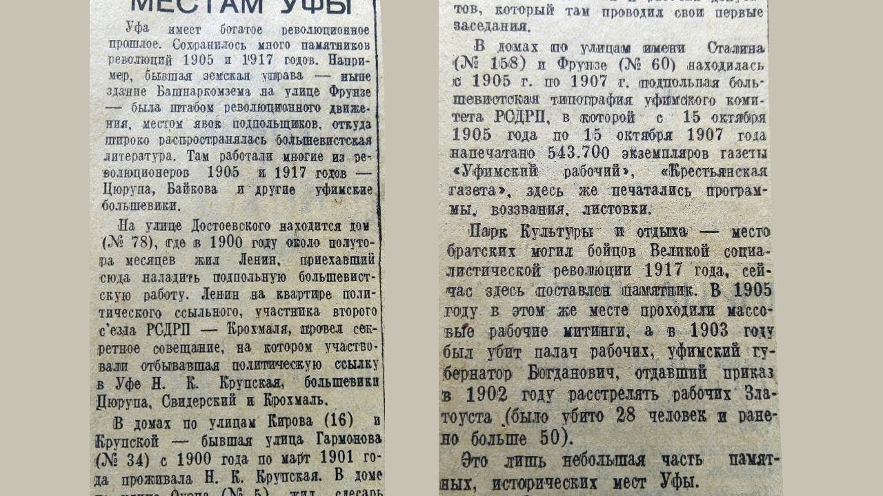 Также газета рассказала о памятных, исторических местах Уфы. В городе с «богатым революционным прошлым» сохранилось много памятников революций 1905 и 1917 годов. «На улице Достоевского находится дом, где в 1900 году около полутора месяцев жил Ленин, приехавший сюда наладить подпольную большевистскую работу».