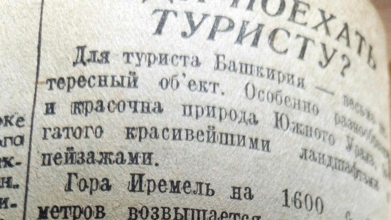 «Для туриста Башкирия - весьма интересный объект. Особенно разнообразна и красочна природа Южного Урала, богатого красивейшими ландшафтами и пейзажами», - говорится в газете. В 1937 году всё большее внимание туристов привлекали гора Иремель и Капова пещера в Бурзянском районе. Куполообразная вершина горы Иремель, окруженная густой пеленой облаков и туманов, видна лишь в ясную погоду. Со склонов этой горы, возвышающейся на 1600 метров над уровнем моря, брала свое начало река Белая. Она разрабатывала свое ложе, рассекая хребты и образуя отвесные, как стены, утесы. «Эти скалистые береговые обнажения, с выбеленной в течение веков весенними половодьями полосой, покрытые шапкой сосново-березовых лесов, тянутся на сотни километров, чаруя дикой красотой, подавляя безмолвным величием». В издании отмечается, что путешествие на лодке в верховьях Белой, богатое разнообразием и сменой впечатлений, является одним из лучших видов отдыха. На вершине горы Иремель, под пирамидой, в груде камней находилась жестяная банка, в которую достигшие вершины складывали свои записки с посланиями. Из них было видно, что на горе побывало много людей разных профессий: инженеры, геологи, почвоведы, учащиеся, колхозники. Однако эти посещения в большинстве своем производились одиночными группами, «что весьма сильно снижало их ценность».