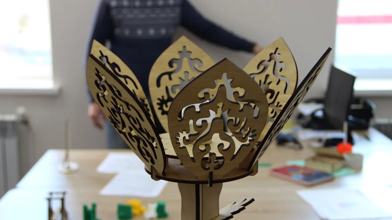 «Мы выбрали сложную, так называемую бионическую форму - светильник получился в форме цветка с башкирскими узорами, - рассказал руководитель студии программирования Олег Шепелькевич. - Никита сам выводил всё в программе КОМПАС-3D. После того, как модель полностью отрисована, станок сам вырезает предметы из фанеры».