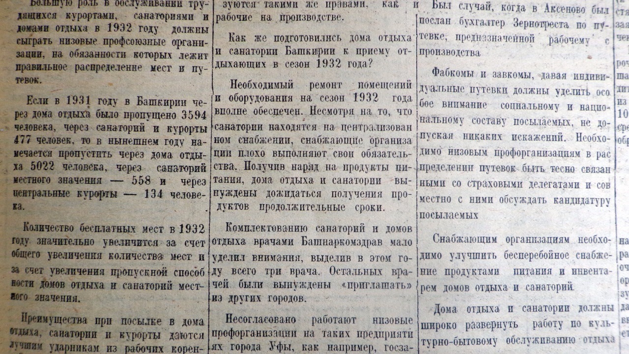 В 30-х годах прошлого века большую роль в обслуживании трудящихся курортами, санаториями и домами отдыха играли низовые профсоюзные организации. В их обязанности входило правильное распределение мест и путевок. «Если в 1931 году в Башкирии через дома отдыха было пропущено 3594 человека, через санаторий и курорты 477 человек, то в 1932 году намечается пропустить через дома отдыха 5022 человека, через санаторий местного значения - 558 и через центральные курорты - 134 человека», - информировало издание. Причем количество бесплатных мест к 1932 году было значительно увеличено за счет возросшей пропускной способности местных курортов.