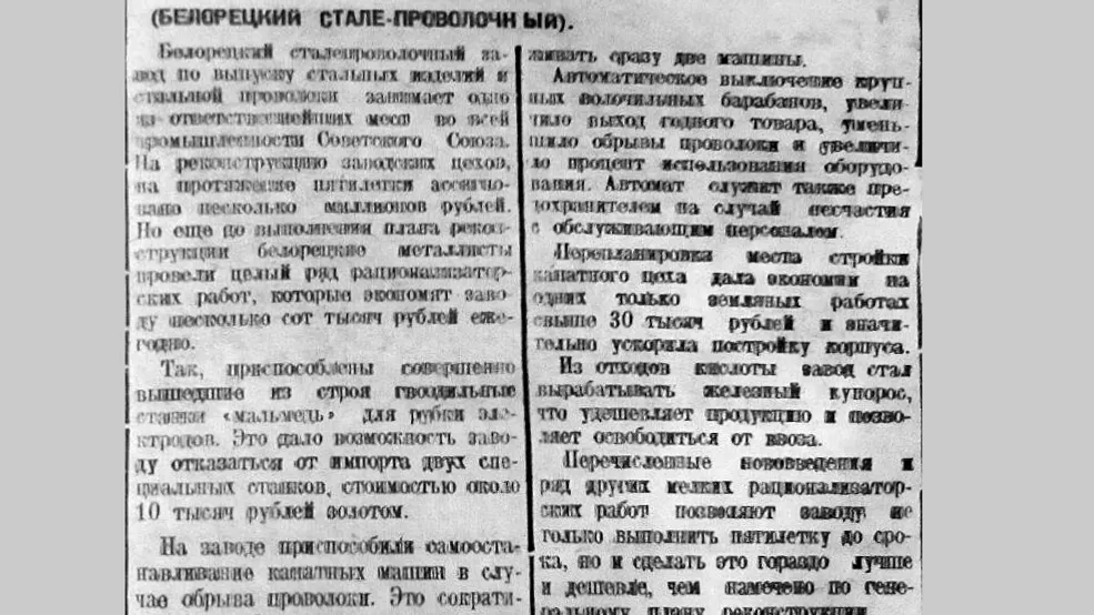«Белорецкий сталепроволочный завод по выпуску стальных изделий и стальной проволоки занимает одно из ответственнейших мест во всей промышленности Советского Союза», - сообщила газета. На реконструкцию заводских цехов на протяжении пятилетки было ассигновано несколько миллионов рублей. Но еще до выполнения плана реконструкции белорецкие металлисты провели целый ряд рационализаторских работ, которые экономили заводу несколько сот тысяч рублей ежегодно.