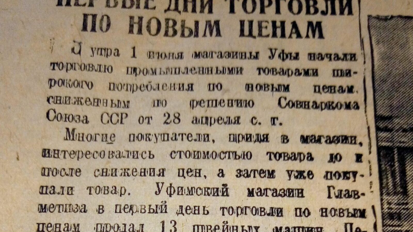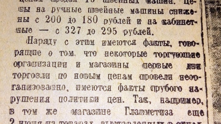 «С 1 июня магазины Уфы начали торговлю промышленными товарами широкого потребления по новым ценам, сниженным по решению Совнаркома СССР от 28 апреля сего года», - информировало издание. Многие покупатели, придя в магазин, интересовались стоимостью товара до и после снижения цен, а затем уже покупали. Уфимский магазин Главметиза в первый день торговли по новым ценам продал сразу 13 швейных машин. Цены на ручные швейные машины были снижены с 200 до 180 рублей, на кабинетные с 327 до 295 рублей, говорится в газете.