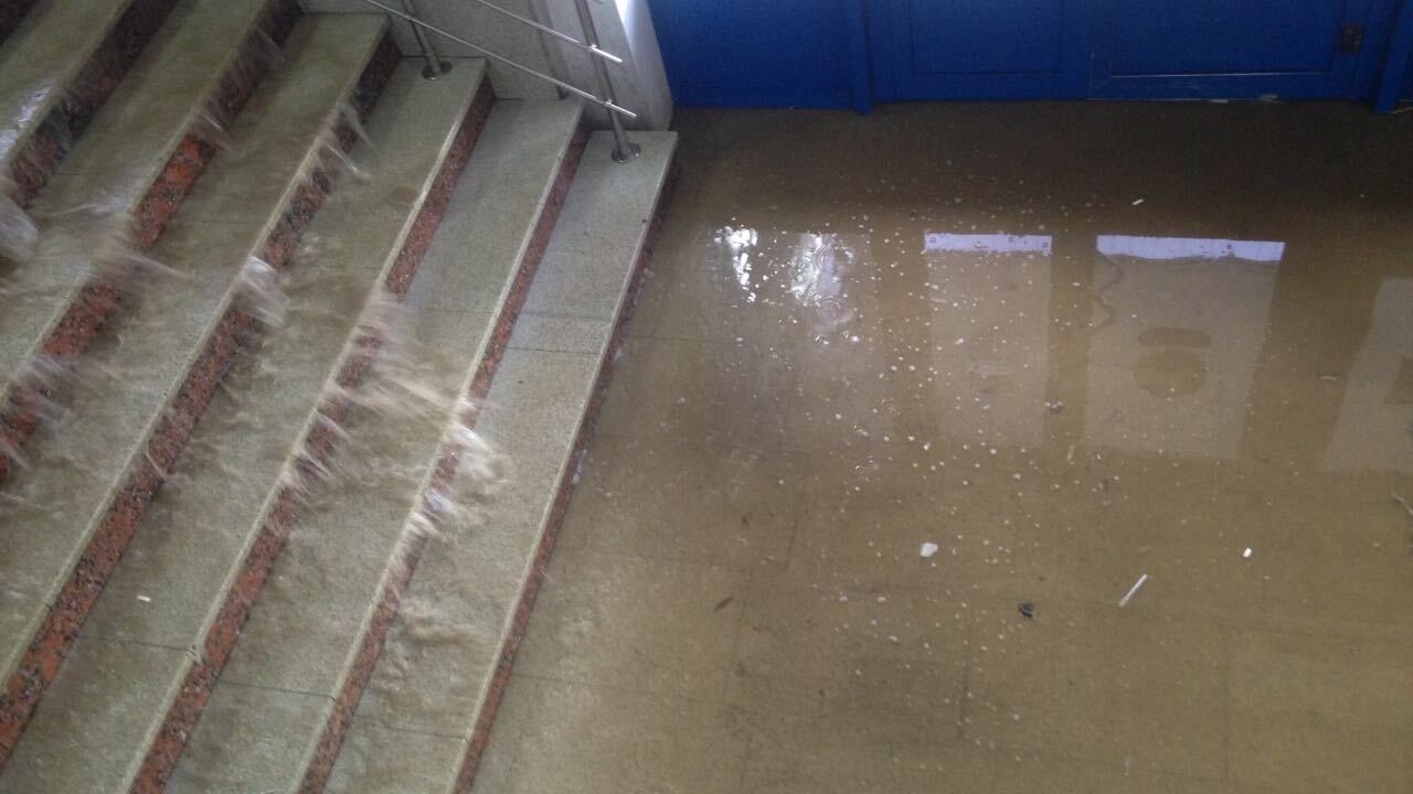 По снимкам видно, как вода льется по ступенькам к входной группе, а один из работников пытается разогнать лужу с помощью веника.