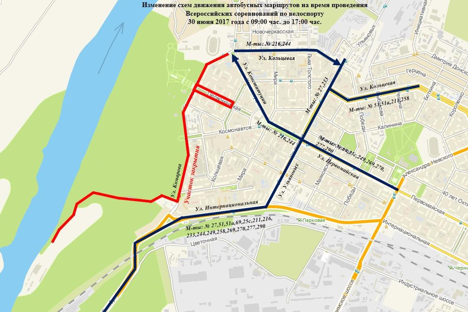 30 июня с 9 до 17 часов по маршруту: СОК «Биатлон» – ул. Комарова – ул. Первомайская – ул. Кольцевая – ул. Первомайская – ул. Комарова – СОК «Биатлон»;