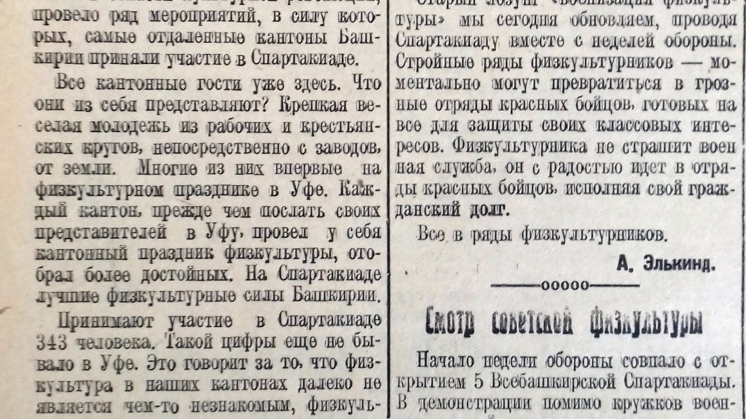 15 июля 1927 года в республике началась V Всебашкирская спартакиада. «Правительство Башкирии, учитывая особое значение Спартакиады как в политическом отношении, так и в области культурной революции, провело ряд мероприятий, в силу которых самые отдаленные кантоны Башкирии приняли участие в Спартакиаде», - сообщила газета.