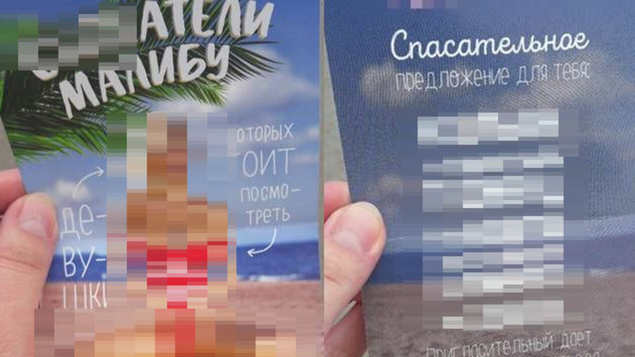 На одной стороне пригласительного буклета в недвусмысленной позе изображена блондинка в красном купальнике, а на другой заманчивые предложения, сроки их действия, а также контактные данные.