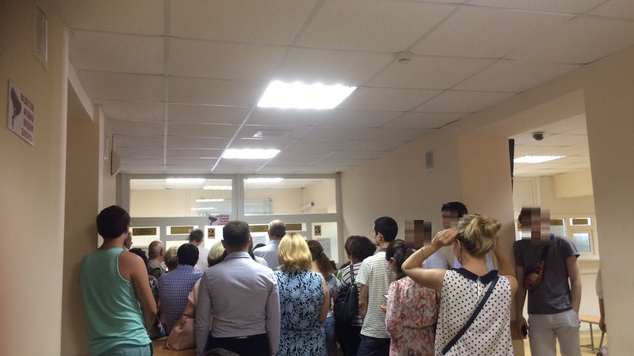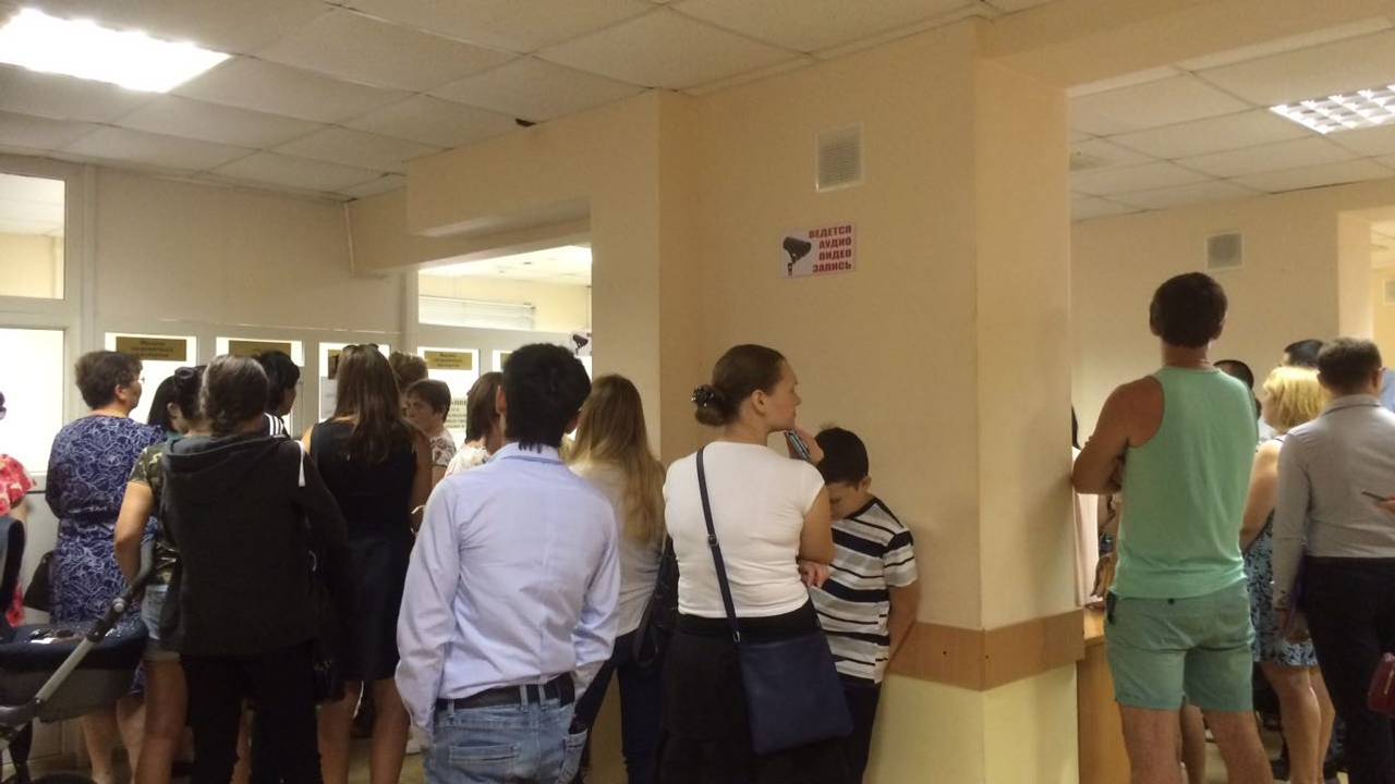 В помещении очень душно, все обмахиваются листочками. Скамейки заняты. В УФМС живая очередь, никаких терминалов, как в банках, здесь нет.