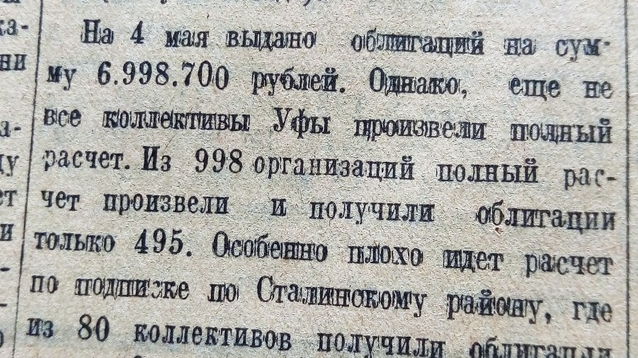 В конце апреля 1937 года уфимская городская сберкасса №61 начала выдачу трудовым коллективам облигаций «Второй пятилетки» (выпуск четвертого года). На 4 мая того же года было выдано облигаций госзайма на сумму 6 млн 998 тысяч 700 рублей. «Однако еще не все коллективы Уфы произвели полный расчет, - отмечается в газете. - Из 998 организаций полный расчет произвели и получили облигации только 495». Особенно плохо рассчитывались по подписке на займы в Сталинском районе (ныне Калининский район). Здесь из 80 коллективов получили облигации лишь 40. На 25 мая был намечен первый тираж займа «Второй пятилетки». «К этому сроку каждый подписчик должен получить свои облигации на руки», - напомнило издание.