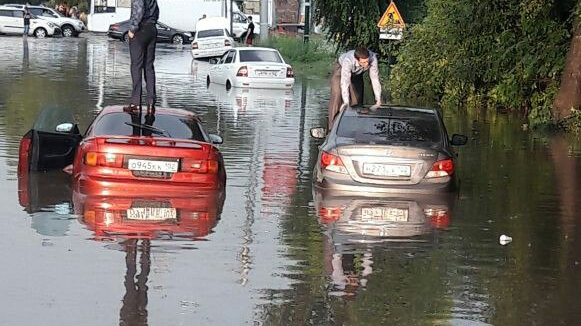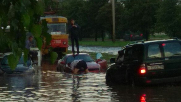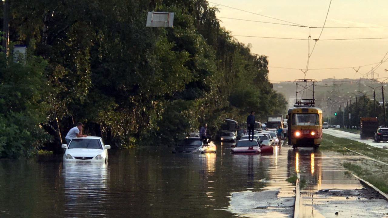 УФА, 1 авг 2017. /ИА «Башинформ», Галия Набиева/. Обрушившийся на столицу Башкирии ливень затопил несколько машин в северной части города. Потоки дождя затопили улицу Трамвайную. В плену стихии оказались как автомобили, так и их владельцы, сообщается в сообществе