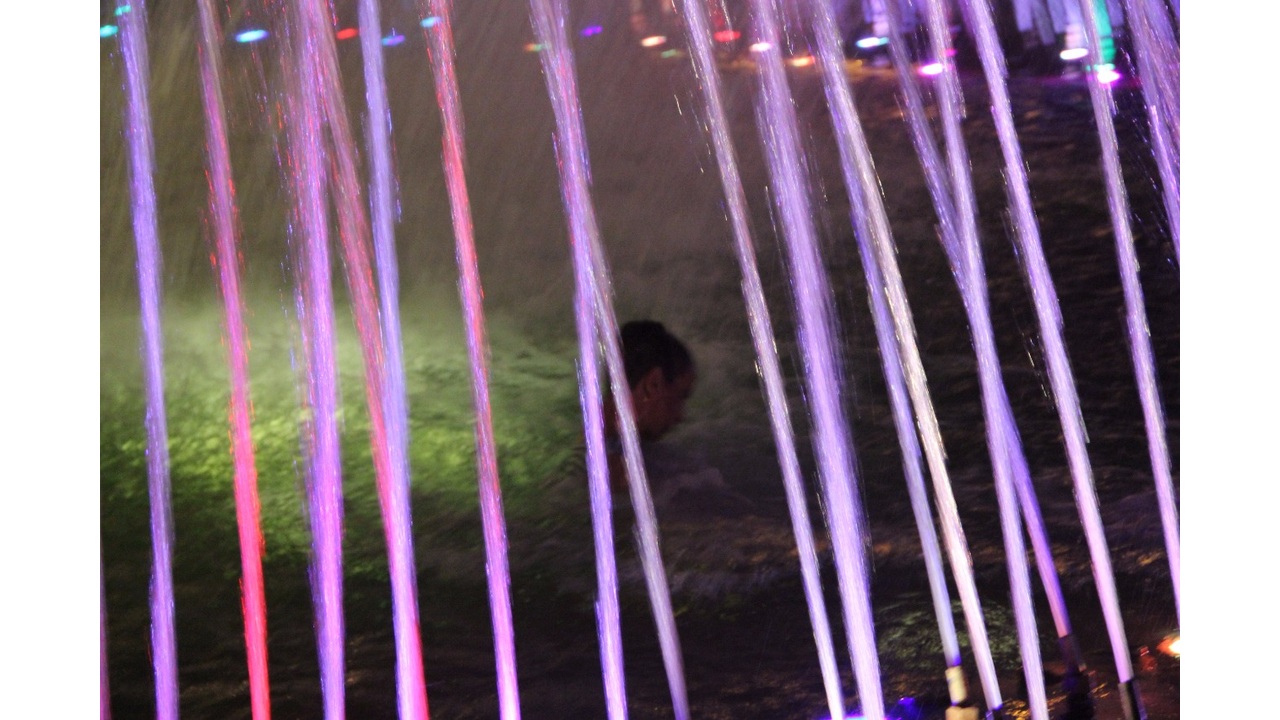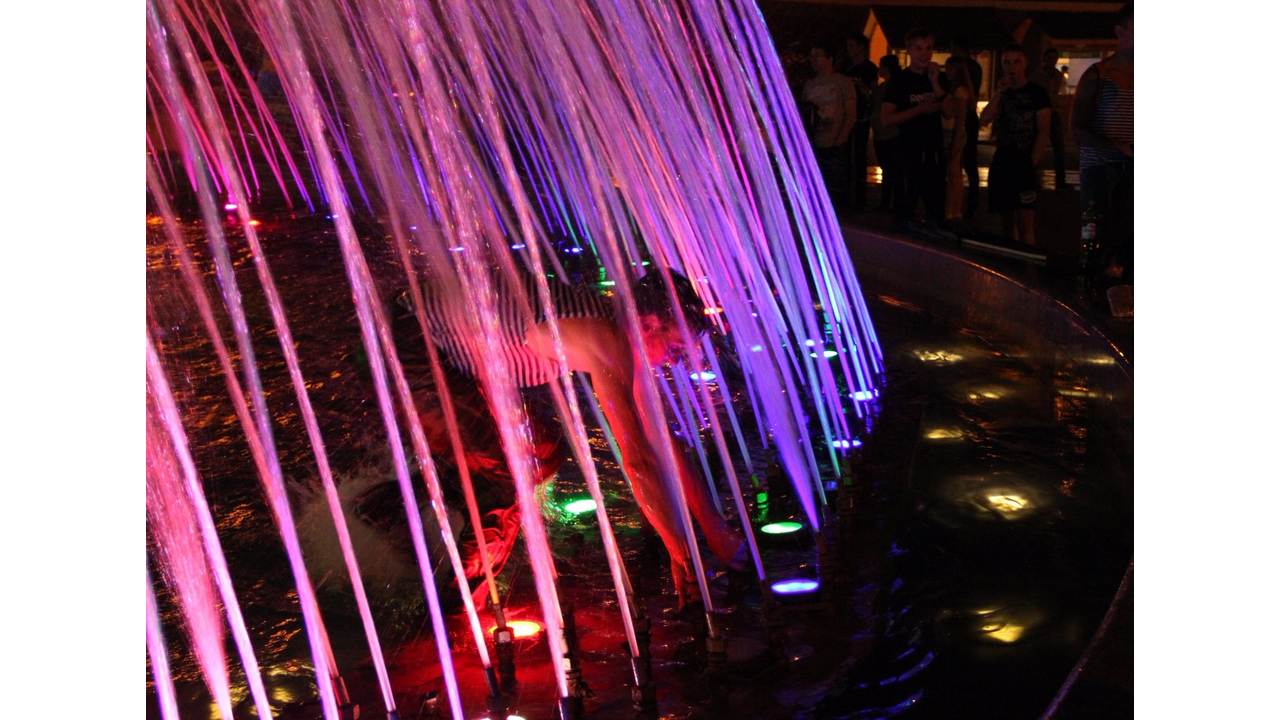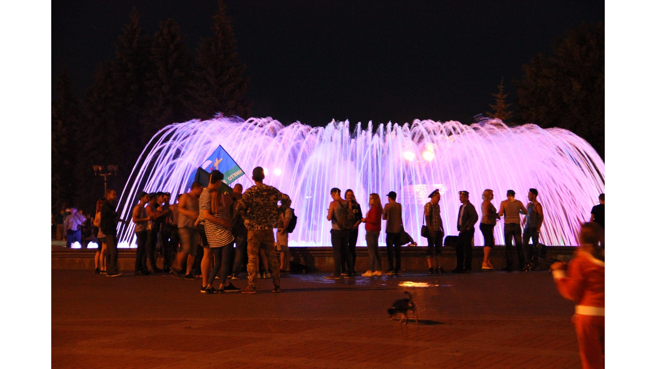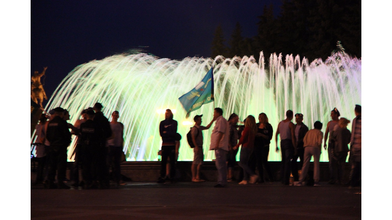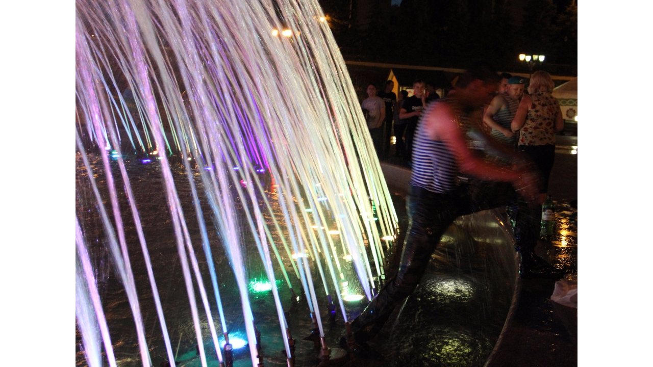У ярко-подсвеченного центрального фонтана градус веселья заметно повышался. Разгоряченные песнями под гитару десантники никак не могли пренебречь «традицией» освежиться в воде. Полицейские следили за порядком, делали предупреждение. Тем не менее, празднующие свой профессиональный праздник поочередно на несколько секунд запрыгивали в фонтан. Затем, с нескрываемой радостью и даже гордостью, вылезали из воды и передавали эстафету своим сослуживцам.