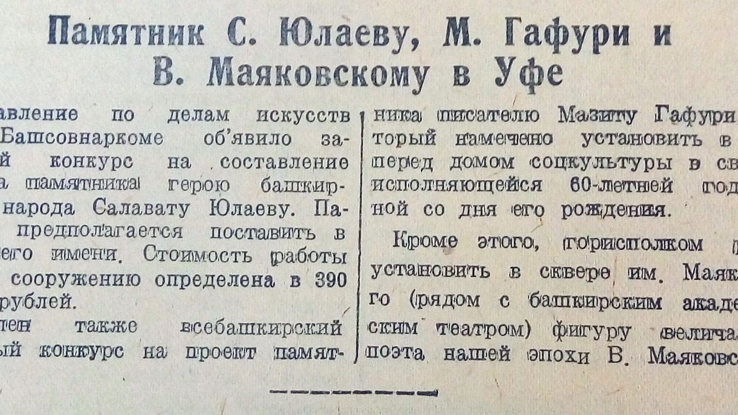 Также издание информировало, что «Управление по делам искусств при Башсовнаркоме объявило закрытый конкурс на составление проекта памятника герою башкирского народа Салавату Юлаеву». Стоимость работы по его сооружению составляла 390 тысяч рублей. Еще был объявлен всебашкирский конкурс на проект памятника писателю Мажиту Гафури. А в уфимском сквере рядом с Башкирским академическим театром решили установить «фигуру величайшего поэта эпохи Владимира Маяковского».