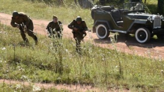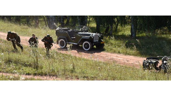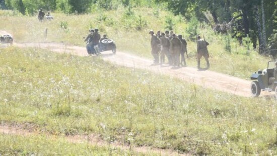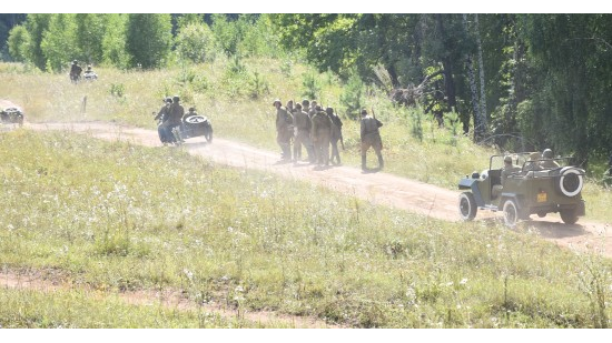 Запах дыма и пороха окунул зрителей в настоящую боевую атмосферу, заставив поверить, что всё происходит на самом деле. Затаив дыхание, люди следили за стремительно разворачивающимися событиями. Вначале действия на проезжавших мимо советских солдат неожиданно напали немецкие войска, завязалась перестрелка. Благодаря слаженным действиям и отваге красноармейцев фашисты были выгнаны из засады.